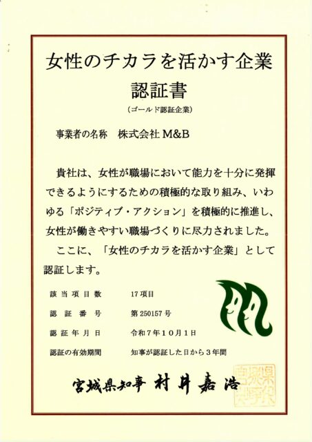 株式会社M&Bは2025年10月1日宮城県が実施する認証制度のひとつである女性のチカラを活かす企業にゴールド認証を更新いたしました。